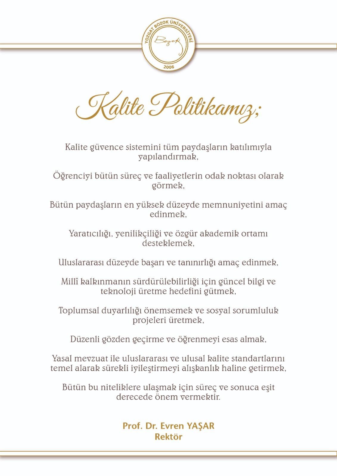 Yozgat Bozok Üniversitesi; eğitim-öğretim ve araştırma faaliyetleri ile idari hizmetlerinin iç ve dış kalite güvencesi ve akreditasyon süreçleri konularındaki çalışmaları bir çatı altında toplayarak çıkarmış olduğu Yönerge ile Kalite Komisyonunu oluşturmuştur. Kalite Komisyonumuz üniversitemizdeki yükseköğretimde kalitenin artırılması çerçevesinde faaliyetlerini sürdürmektedir. Birimler ile Kalite Komisyonu arasındaki bağlantıyı kurmak ve Komisyon tarafından alınan kararları uygulamak amacıyla 2017 yılında üniversitemizde Akreditasyon ve Kalite Koordinatörlüğü kurulmuştur. Ayrıca, akademik ve idari birimler kendi bünyelerinde oluşturulduğu kalite komiyonları ile tüm süreçlerini birimlerinde uygulamaktadırlar. Kalite Güvence Sistemi verilere dayalı bir süreç (planla, uygula, kontrol et ve önlem al) olması nedeniyle, üniversitemizde gerçekleştirilen tüm faaliyetler için veri temin edilmesi çalışmaları başlatılmıştır. Bu amaç için öncelikle çalışanların ve hizmet alanların memnuniyet düzeylerinin belirlenmesi çalışmaları başlatılmıştır. Bu amaç için öğrenci, personel ve mezun anketleri düzenlenmekte, alınan veriler değerlendirilerek sunulan hizmetlerin kalitesi artırılmaya çalışılmaktadır. Bu veri toplama daha da sistemik bir hale getirilerek birimler kendi öğrencisi, personeli ve mezunları ile daha ayrıntılı anketler yaparak, kendi biriminde sunulan hizmetlerin kalitesini artırmak için faaliyetler yapacaklardır. Komisyonumuz üniversitemizin belirlemiş olduğu kalite politikası çerçevesinde faaliyetlerini sürdürmektedir.
